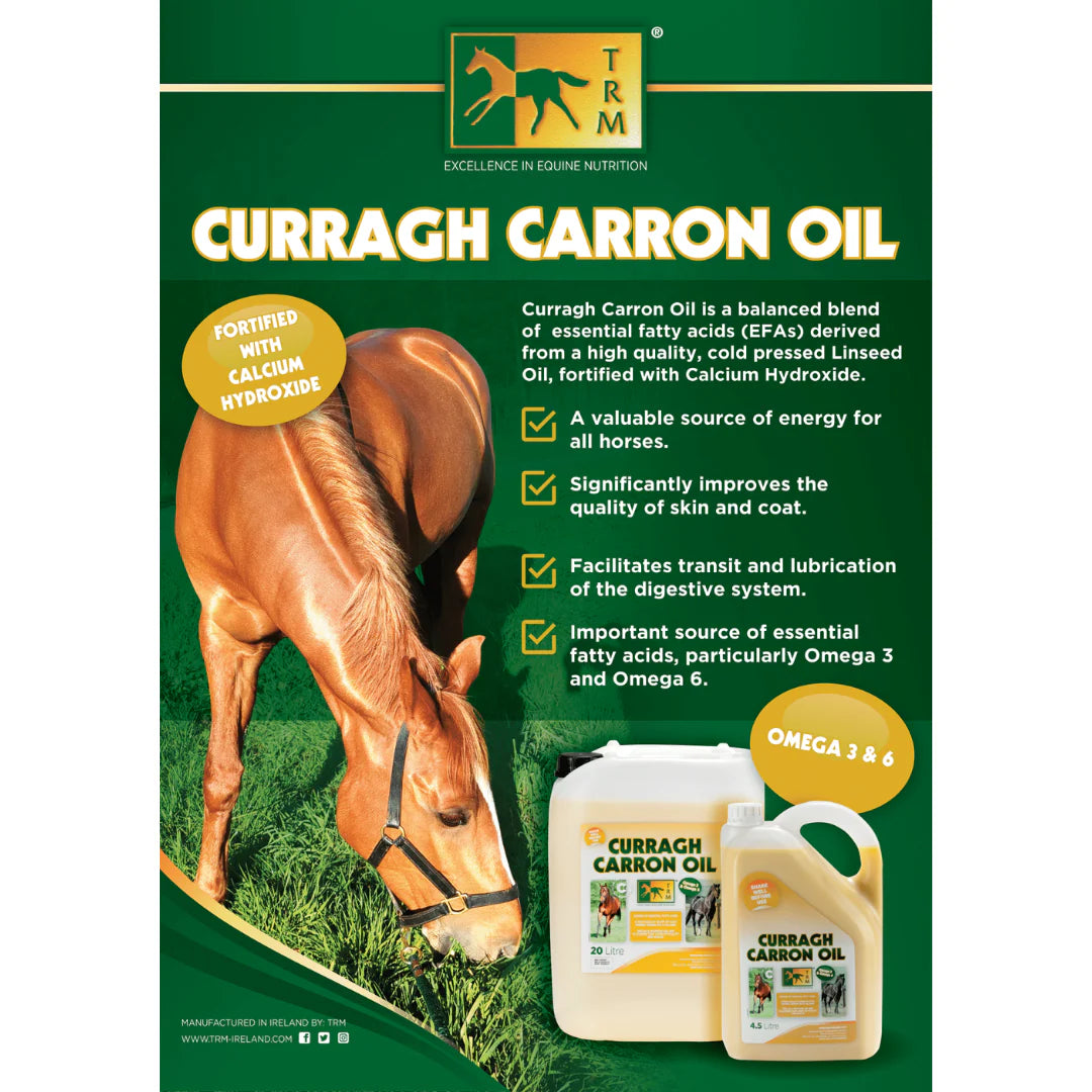 Curragh Carron Oil is a balanced blend of Essential Fatty Acids (EFAs) derived from a high quality, cold pressed Linseed Oil, fortified with Calcium Hydroxide. The Essential Fatty Acids (EFAs) Omega 3 and Omega 6 are both critical for health, and have important structural and functional roles in the body. In particular the conversion products from the Omega 3 fatty acid Alpha-linolenic include eicosapentaenoic acid (EPA) and docosahexaenoic acid (DHA.) Research has shown that providing EPA and DHA in the diet reduces inflammatory responses and assists in the maintenance of a healthy circulatory system.