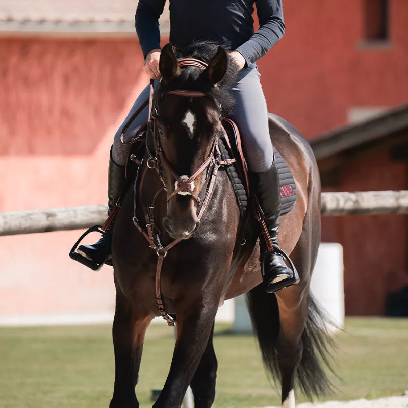 This anatomic snaffle is very comfortable for the horse and is technically designed for a better feel. The headpiece is made of very soft calfskin covering a thin layer of foam that absorbs a number of shocks in the horse's neck. The cut back headpiece enables the horse's ears to move perfectly and avoid pressure on the neck The cross noseband has a sheepskin pad on the middle of the figure of 8. This noseband is made to close the horse's mouth at two points, towards the jaw and towards the chin. This product is very well finished, the cheek straps both have hook fastenings, and the entire snaffle has white stitching. This is a very high quality product made of both vegetable-dyed leather and soft calfskin. Reins are sold separately.