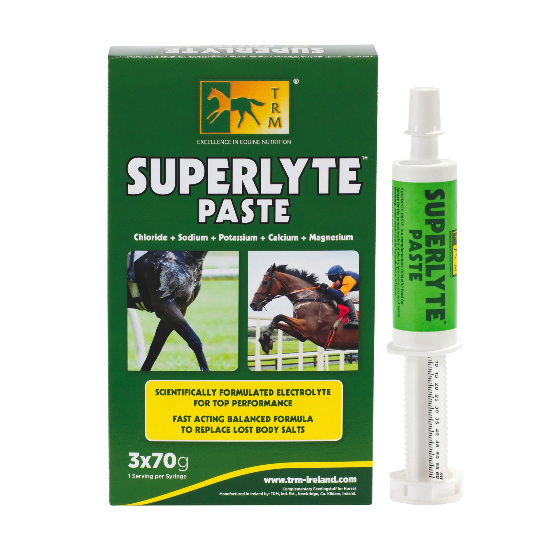 During strenuous, prolonged exercise a horse can lose up to 10 litres of sweat which contains Sodium, Chloride and Potassium. Superlyte Syringe has been formulated to rapidly replace these Electrolytes in the same proportions in which they are lost, thus ensuring optimum recovery. The product is fed orally and is particularly convenient immediately after competition, intense training or during transportation.
