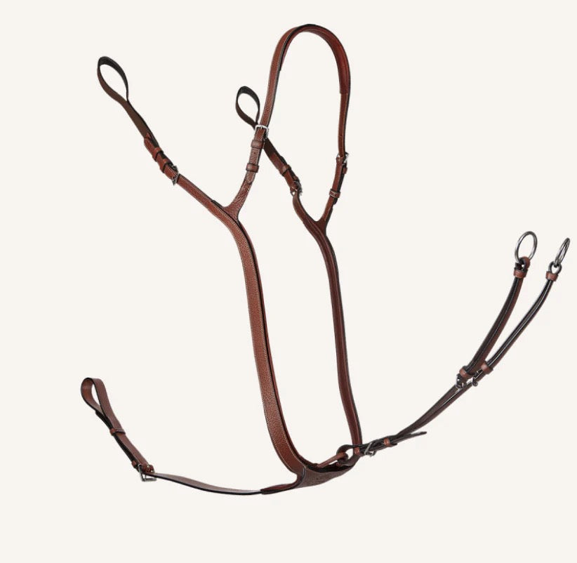 Padded, grained leather breastplate to hold the saddle in place. The special hunting breastplate shape frees up the shoulders and ensures the horse’s freedom of movement. The girth strap fastening system prevents friction on the horse’s shoulders. Adjustable bridge allowing a perfect fit to the morphology of the horse. Made up of a removable martingale with two rings.