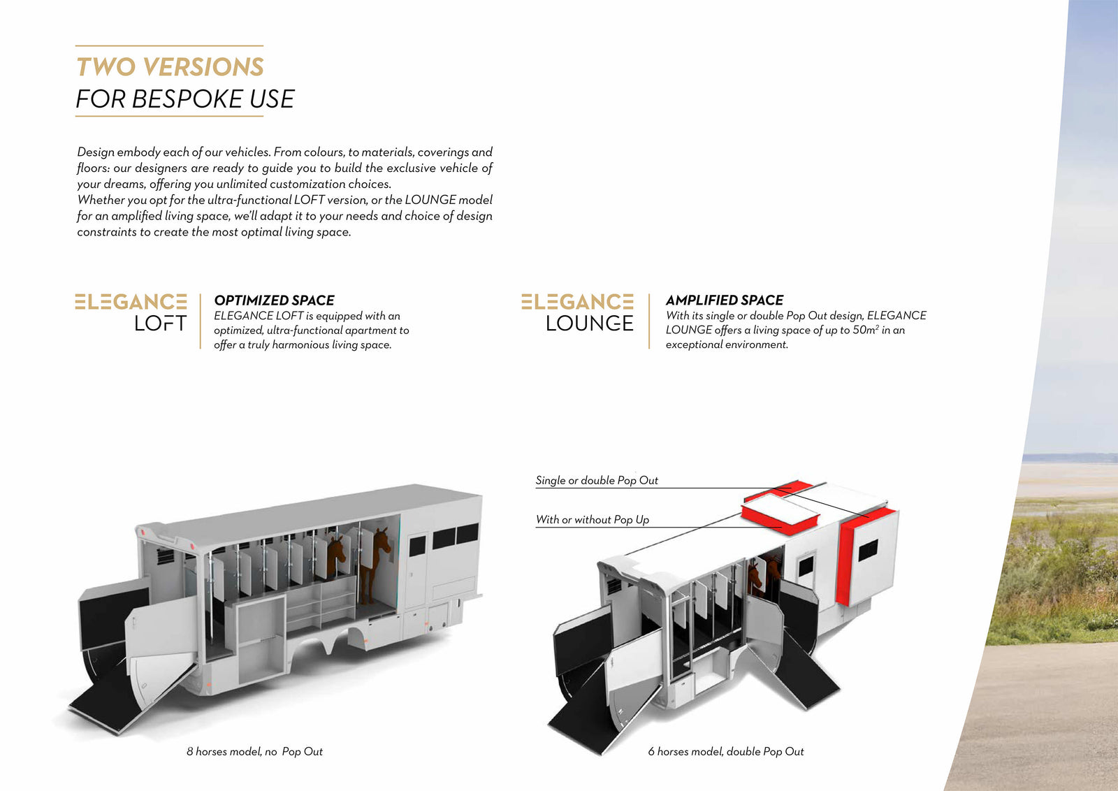 Offering a fully adaptable interior, the Elegance allows you to personalise every aspect of your vehicle, from the horse area to the living quarters. Whether you choose the ultra-functional LOFT version or the more spacious LOUNGE model, the Elegance is designed around your needs — delivering superior comfort, safety, and style for every journey.